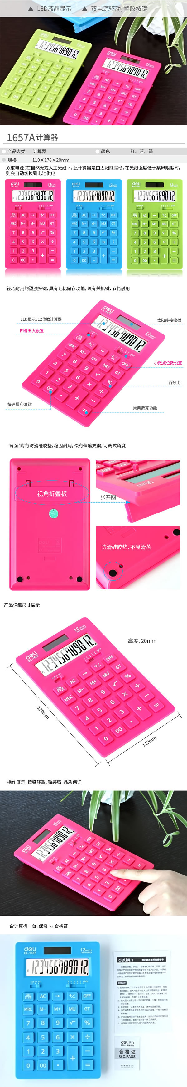得力1657A 文具计算器12位学生太阳能财务会计计算机送电池双电源包邮小型糖果色可爱机算器批发科学计算器的商品信息: