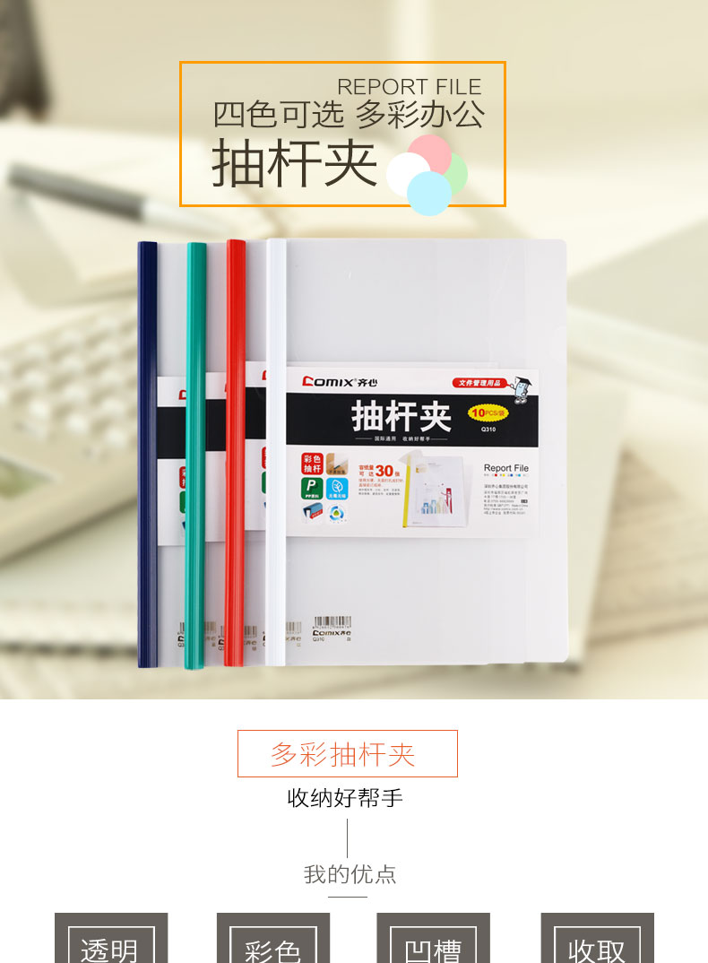 齐心Q310-1抽杆夹彩色拉杆夹文件夹A4透明报告夹办公用品的说明: