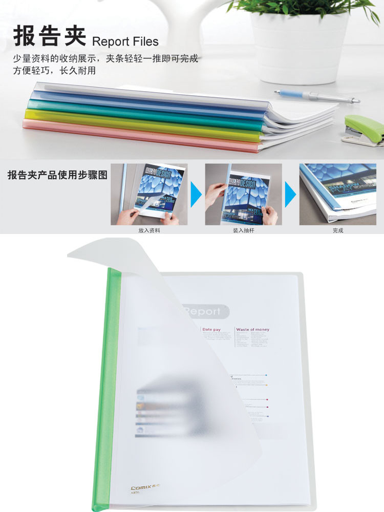 齐心A858 抽杆式报告夹文件透明夹的说明: