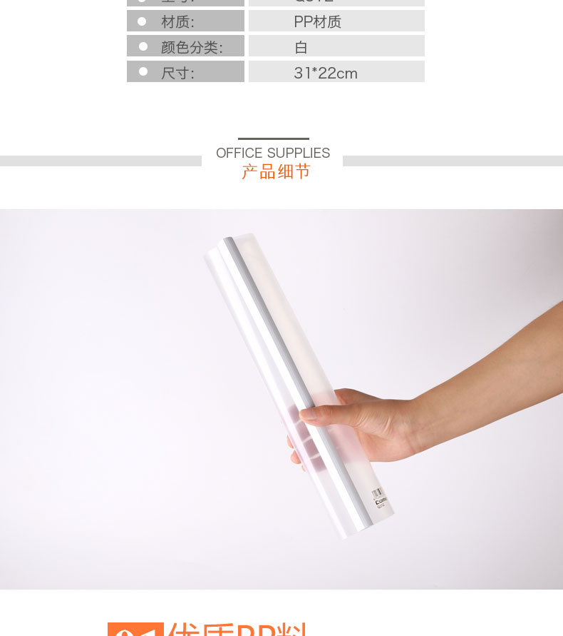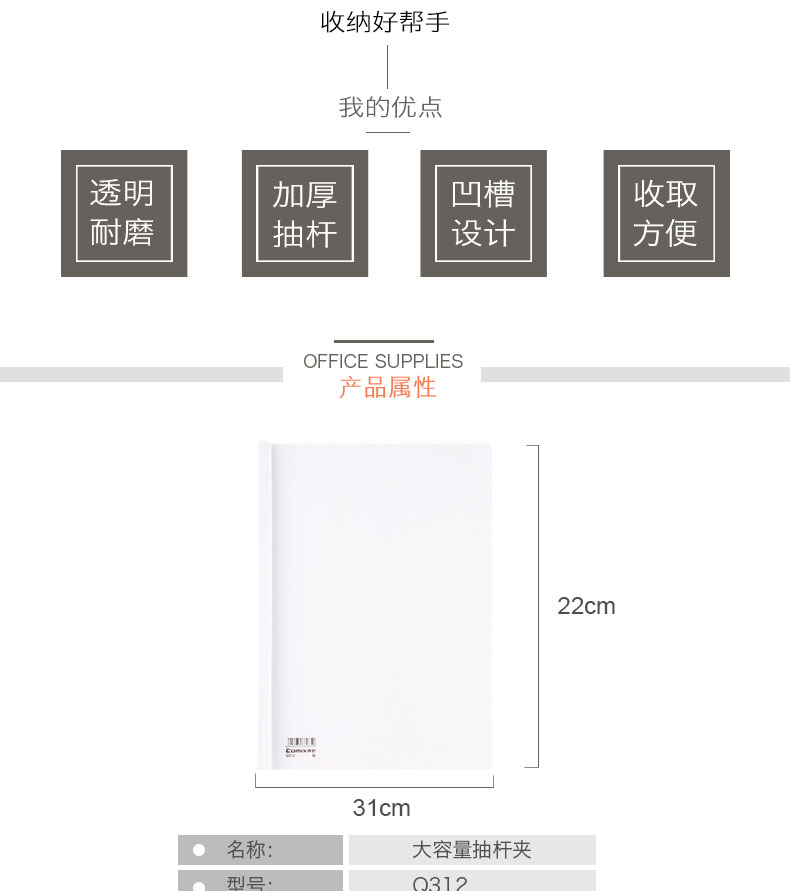 齐心Q312抽杆夹加厚可夹60页型试卷夹文件夹拉杆透明文件夹的说明: