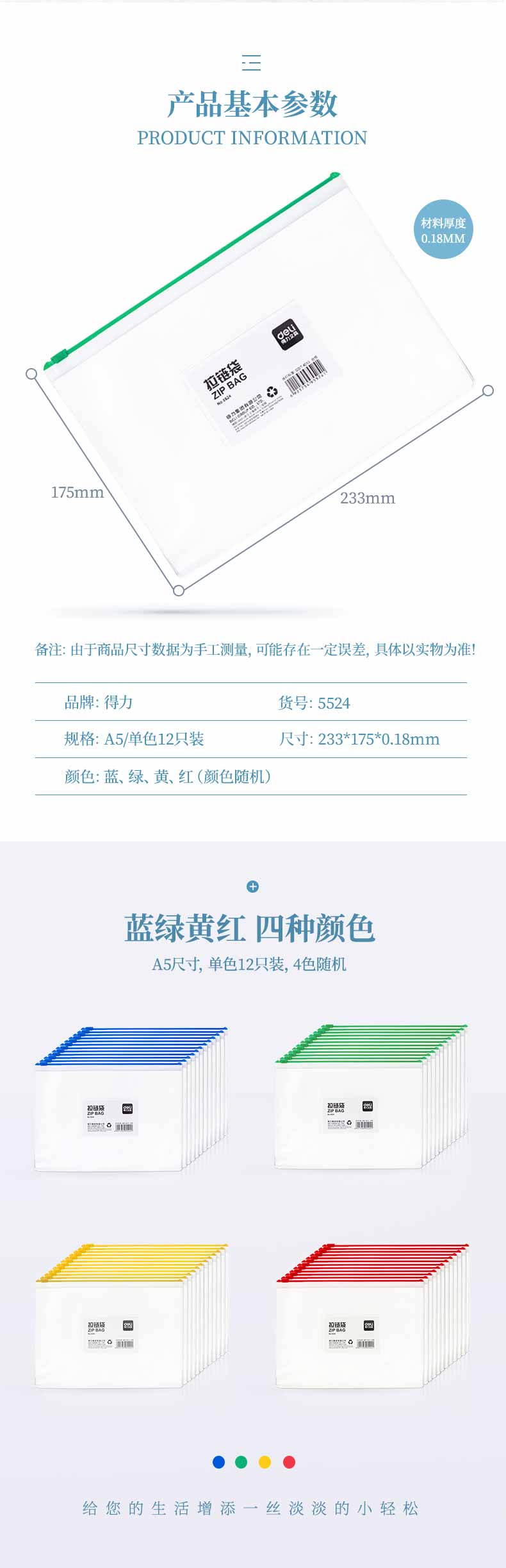 得力拉链袋5524文件袋A5透明资料袋 防水PVC文具袋的说明: