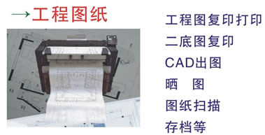 无论是将设计图高速激光打印,还是将图纸任意缩放成A4/A0,或是将厚厚的图纸扫描成电子文档,存于盘中,方便携带,随用随打,又或是晒成蓝图存档,我们保证您的才华会得到最完美逼真地体现。 使用设备:Kyocera K4850数码工程机/延中500无氨晒图机 单机产量:数码打印/复印/扫描:A0为:5张/分钟;